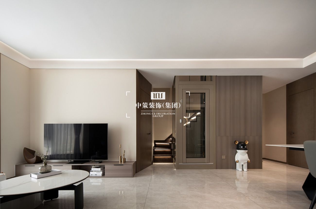 2.客厅空间:在搭建中空的方案上巧妙排布下水管道,增加层高保证一楼的顶面整提效果。