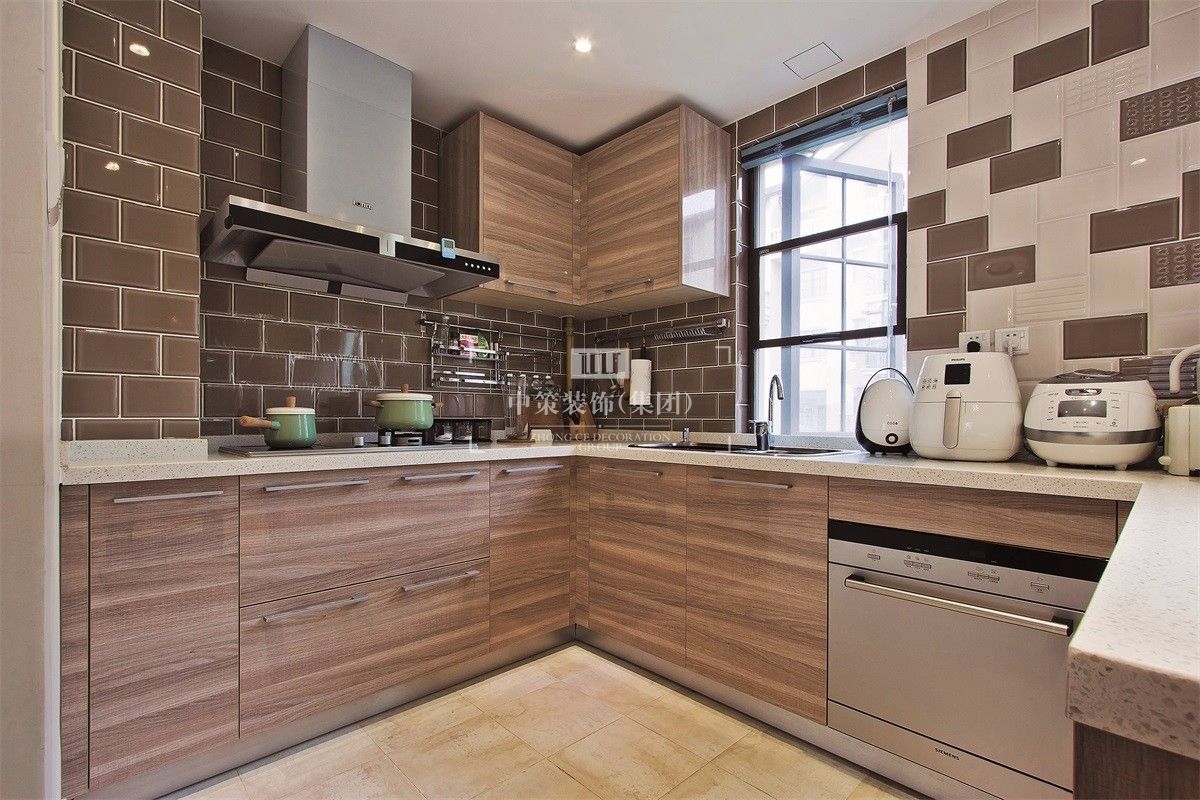客厅里清爽简约风的沙发配以深褐色的民族风压花地毯,和单人深棕皮质沙发,再加上铁艺吊灯和后现代金属质感台灯,让整体呈现出一种奇妙的和谐混搭感。半包围的厨房融合了吧台设计,对于两口之家来说非常方便实用,木质纹理的棕色系颜色搭配,也让人感觉温馨而踏实。饭厅的木质骨架吊灯让人眼前一亮,一侧的装饰壁炉两边看上去只是两面现代风格的地图壁画墙,实际上却是两个嵌入式柜体用于摆放杂物,具有很强的收纳功能。家里最长的一条空白过道本来平淡无奇,但在设计师的精心布置下,却变成了文艺范十足的个性长廊,钢琴和墙体书柜的点缀让房屋呈现出一股浓郁的北欧艺术风。