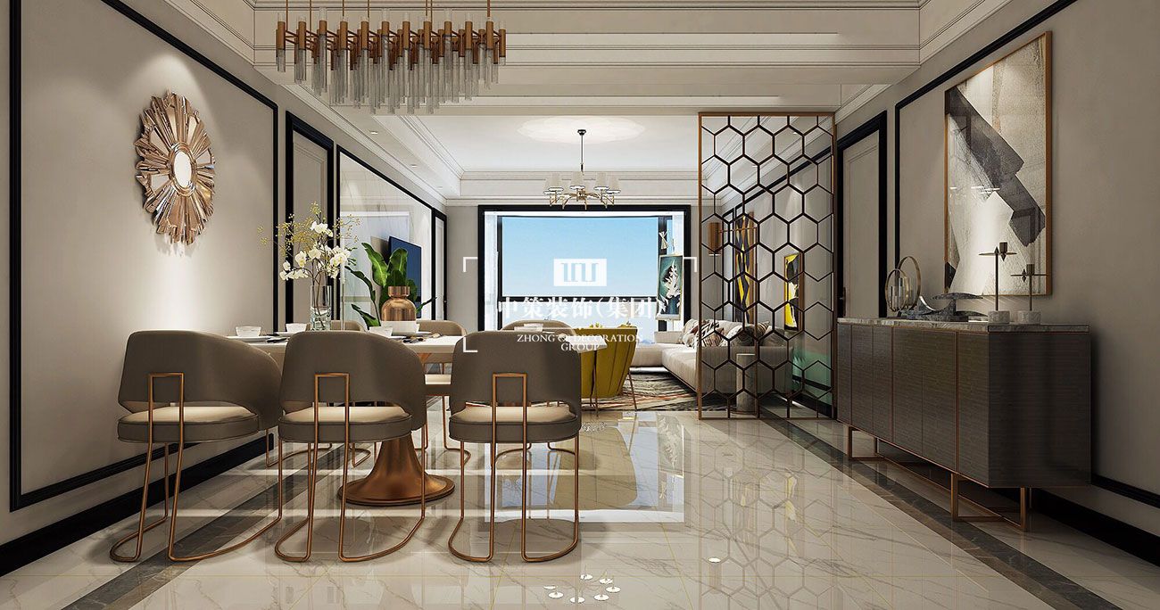 本案整个空间的色彩非常明快,色块与色块之间的搭配规整而和谐,以白色为主的墙面与黑色的线条边框形成鲜明对比的同时,又不失现代轻奢的格调美。浅色的沙发松软而舒适,搭配上旁边的金属茶几和边几,一刚一柔,倒是给人一种不受拘束的自在感。