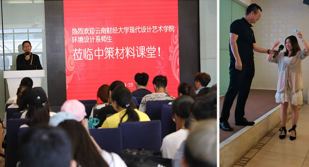 就这么简短的对话,开始了我们的课程筹备,联合了六大主讲材料商精英讲师、全体材料商伙伴、产品中心的家人们共同的努力,与23日正式开始为云南财经大学材料系学子培训材料课程。